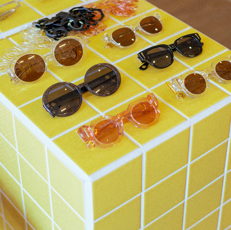 The middle tables were fun. Upcycling two old pythons, Frankie make a mushroom shared tiled main table for the jewellry, a second terracotta tiled table and 4 yellow tiles pitches to use around the space in different formations deepening on shop, or gallery opening or movie night.